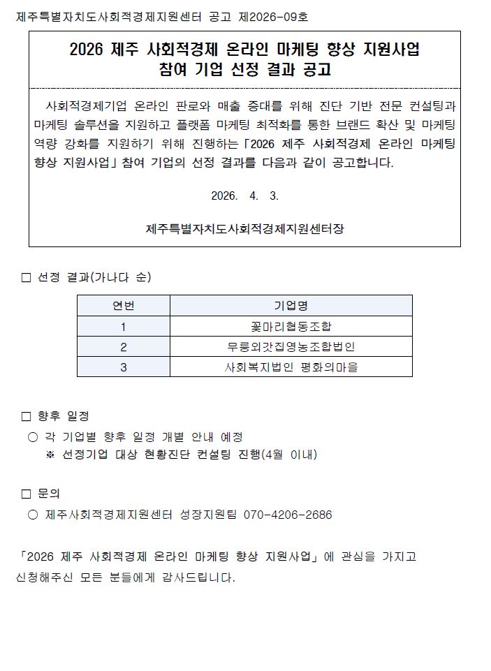 [선정결과] 2026 제주 사회적경제 온라인 마케팅 향상 지원사업 참여 기업 선정 결과 공고