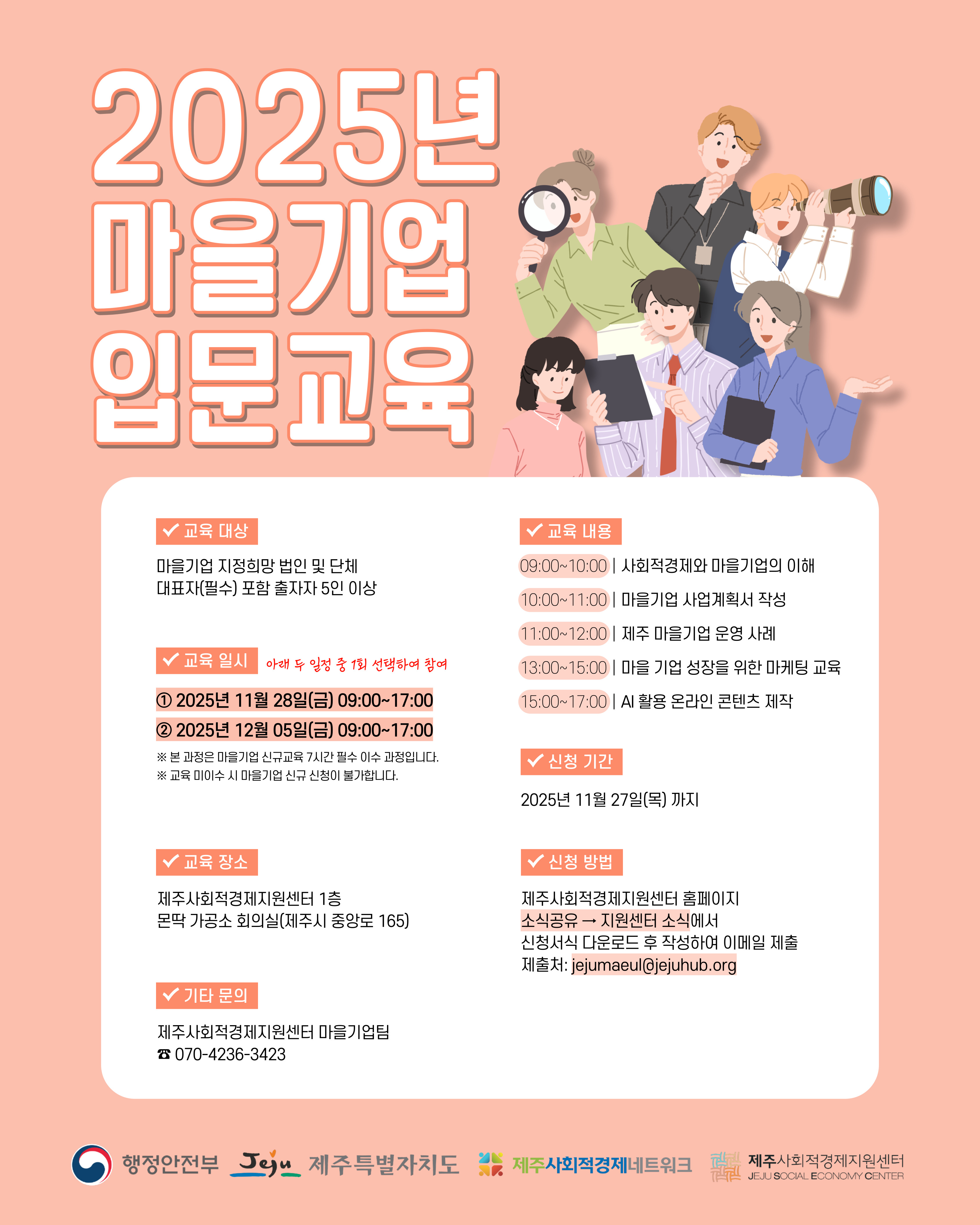 - 교육장소: 제주사회적경제지원센터 1층 몬딱 가공소(제주시 중앙로 165)