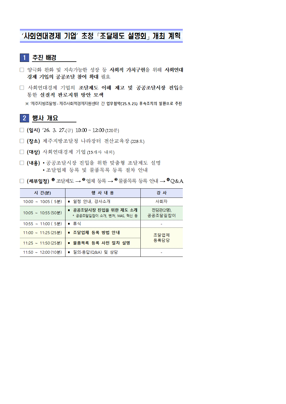 제주지방조달청 사회연대경제 기업 초청 「조달제도 설명회」