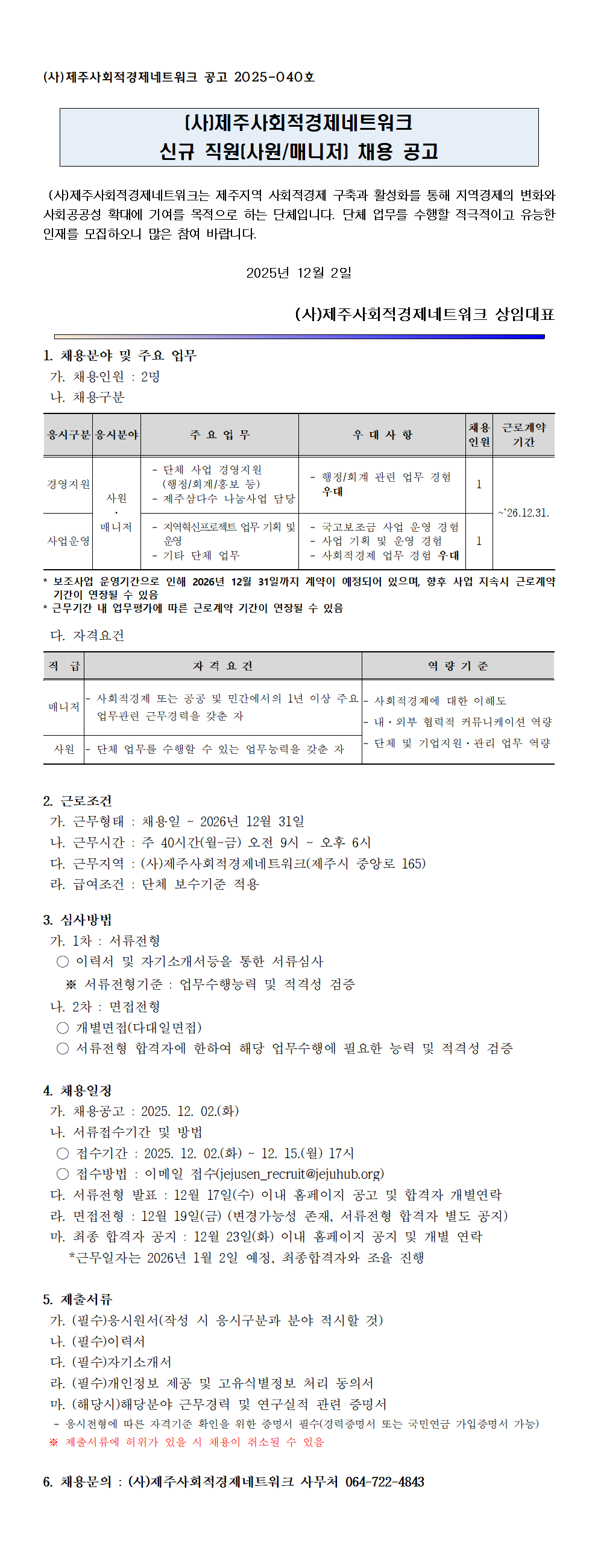 공고 2025-040호 (사)제주사회적경제네트워크 신규 직원(사원, 매니저) 채용공고.pdf