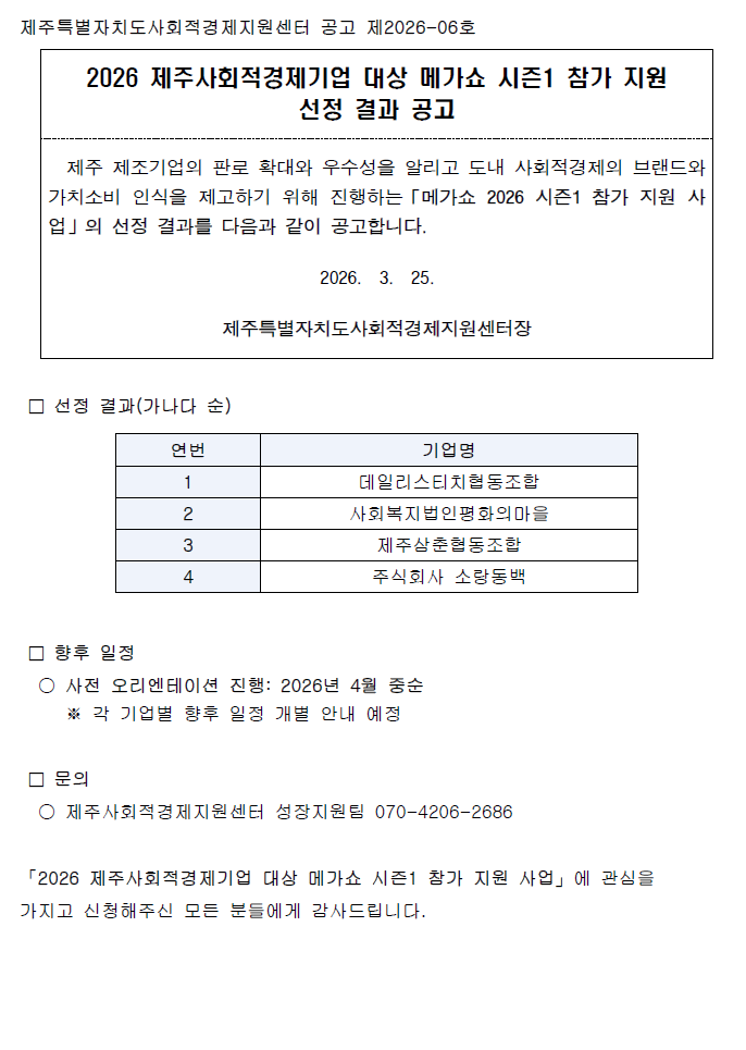 [선정결과] 2026 제주사회적경제기업 대상 메가쇼 시즌1 참가 지원 선정 결과 공고