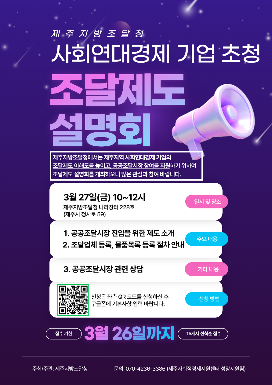 안녕하세요. 제주사회적경제지원센터와 업무협약을 맺은 제주지방조달청에서는 제주지역 사회연대경제 기업의 조달제도 이해도를 높이고, 공공조달시장 참여를 지원하기 위하여 사회연대경제 기업 초청 <조달제도 설명회>를 아래와 같이 개최합니다.